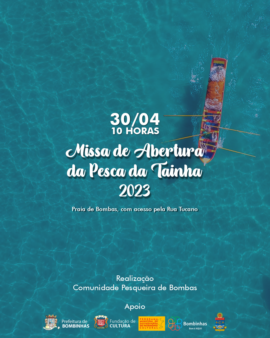 Acontece no domingo, 30 abril, às 10 horas, na Praia de Bombas, com acesso pela Rua Tucano, uma celebração com participação de todos os atores envolvidos no processo da pesca artesanal da tainha: pescadores e familiares, comunidade em geral e visitantes, este ano já em sua 14ª edição.