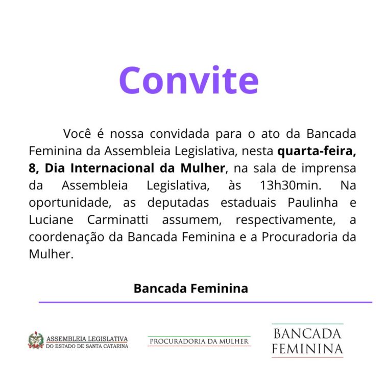No Dia Internacional da Mulher, quarta-feira, 8, a deputada Paulinha (Podemos) assume a coordenadoria da Bancada Feminina da Assembleia Legislativa. A parlamentar, que é a primeira a ocupar a secretaria da Mesa Diretora da Alesc desde Antonieta de Barros, substituirá a também deputada, Luciane Carminatti, que ficará a frente da Procuradoria da Mulher.