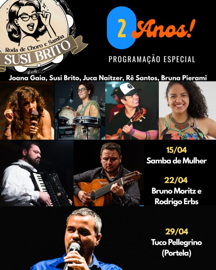 A Roda de Choro e Samba da Susi Brito está em festa!O projeto que acontece todas as 4as feiras no Espaço Cultural MPM completa 02 anos no dia 23 de abril (Dia do Choro!), mas as comemorações iniciam já no dia 15 e vão até o dia 29 de abril.A cada Roda, pocket shows com convidados especiais. Espia só: