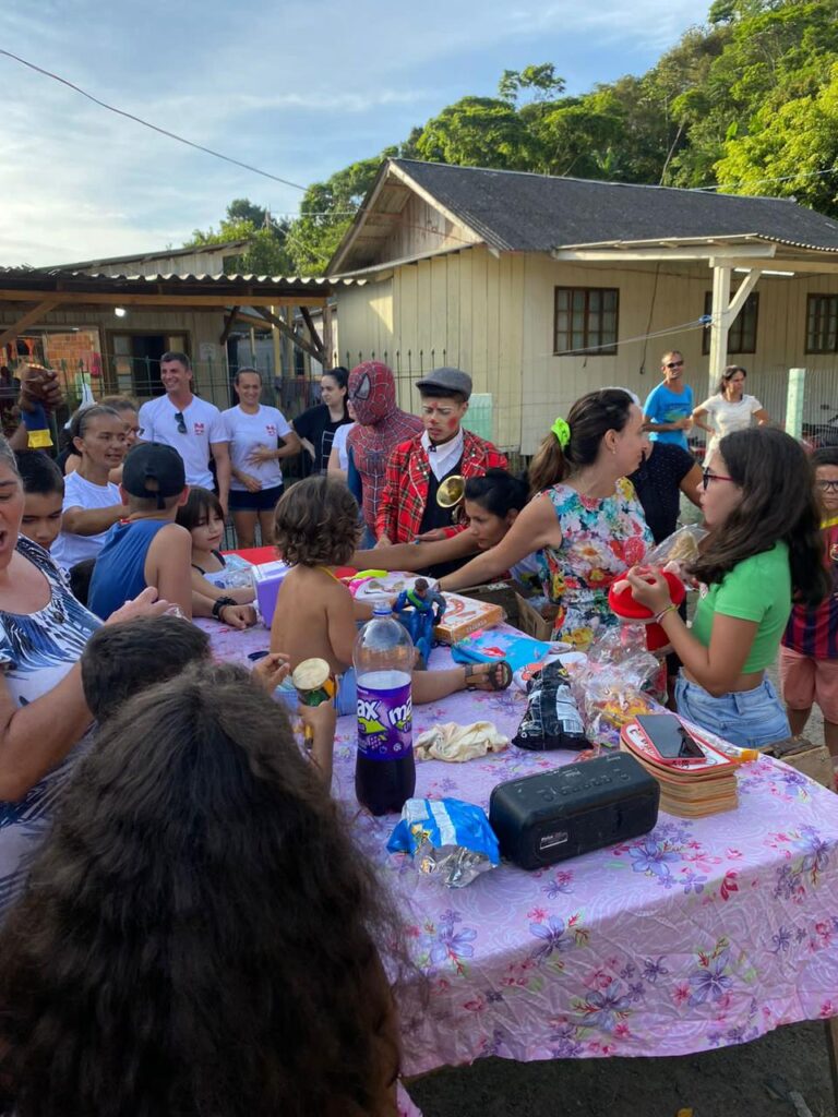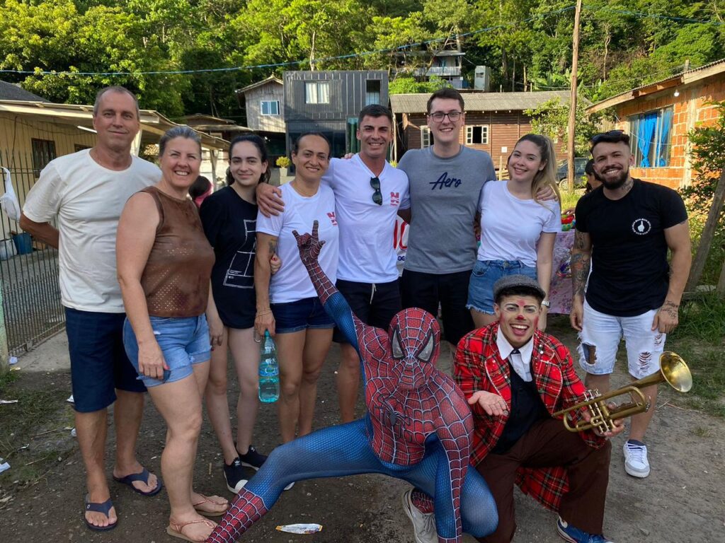 Sábado, dia 23/12, ocorreu o “Natal Solidário – Vila Fortaleza”, ação social que presenteou as crianças da Vila Fortaleza, comunidade do bairro São Judas Tadeu, em Balneário Camboriú. Estiveram presentes os animadores Guilherme, fantasiado de palhaço, e Ian, que foi vestido de Homem-Aranha, que fizeram a alegria da criançada, e também o barbeiro Alan Oliver fazendo cortes de cabelo nos pequenos.