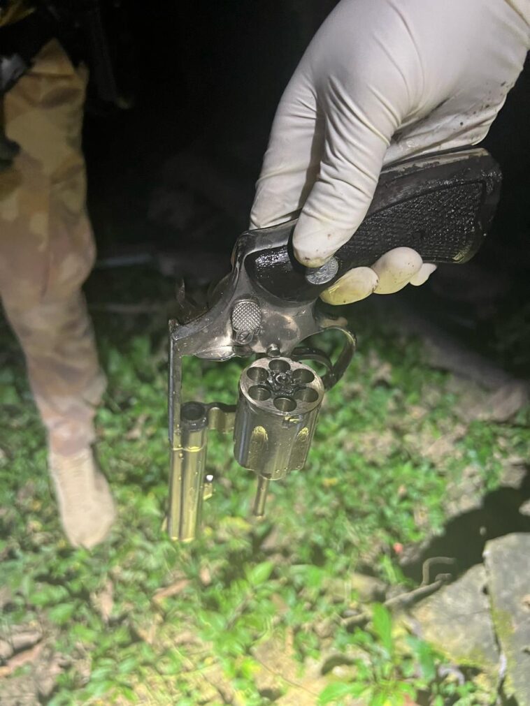Uma das guarnições, ao entrar na rua Maria Maurícia Pereira, local de constante fuga de suspeitos, visualizou um adolescente, correndo em direção à guarnição, portando um revolver, calibre .38, carregado com 6 munições.