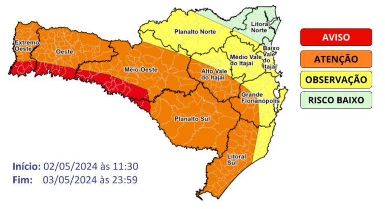 Os altos volumes previstos de chuva trazem risco alto para enxurradas e inundações nas bacias hidrográficas nas regiões do Grande Oeste e Planalto Sul catarinense. Entre esta quinta e sexta-feira, são esperadas elevações significativas nos níveis dos rios nestas regiões, principalmente para o Rio Uruguai em municípios de divisa com o Rio Grande do Sul, como Itapiranga, Mondaí, Palmitos e Águas de Chapecó, além de municípios próximos aos Rios Chapecó, Chapecozinho e do Peixe.
