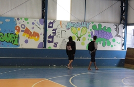 As paredes internas da quadra esportiva do Centro Educacional Municipal (CEM) Tomaz Francisco Garcia ganharam cores e desenhos nesta sexta-feira (19). Orientados pelo artista Fernando dos Santos Cardoso e usando técnicas de graffiti, alunos do 9º ano A da escola coloriram o espaço, deixando a marca deles no local.
