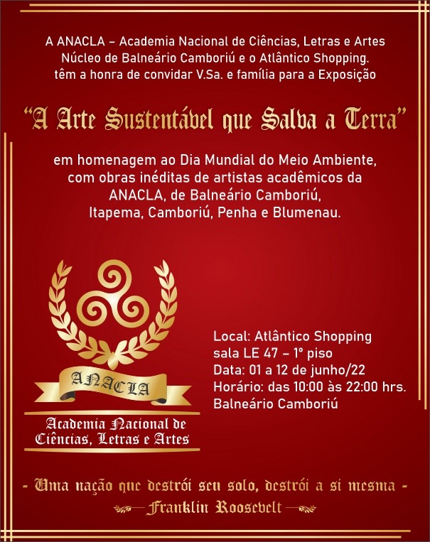 Para celebrar o “Dia Mundial do Meio Ambiente” que acontece no dia 5 junho, a ANACLA – Academia Nacional de Ciências, Letras e Artes – Núcleo de Balneário Camboriú com apoio do Atlântico Shopping, realizam a Exposição “A Arte Sustentável que Salva a Terra”, com obras inéditas de artistas acadêmicos da ANACLA, de Balneário Camboriú, Itapema, Camboriú, Penha e Blumenau.