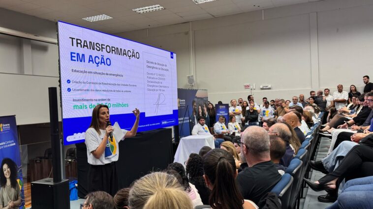 Na área da educação, a prefeita relembrou a situação encontrada nas unidades escolares, a qual resultou na emissão do Decreto nº 12.199/2025, que decretou a situação de emergência na educação. Para auxiliar na recuperação das estruturas, foi criada a Comissão de Reestruturação das Unidades Escolares, responsável pelo levantamento dos danos estruturais de todas as unidades. A previsão de investimento para os reparos é de mais de R$ 50 milhões.