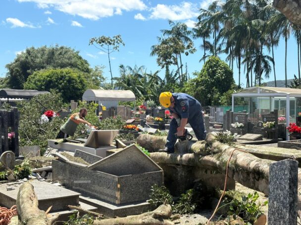 Prefeitura de Camboriú realiza remoção de árvore que caiu sobre túmulos do cemitério no Rio do Meio