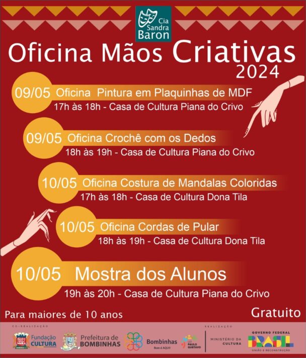 Inscrições para as oficinas do projeto Mãos Criativas, em Bombinhas