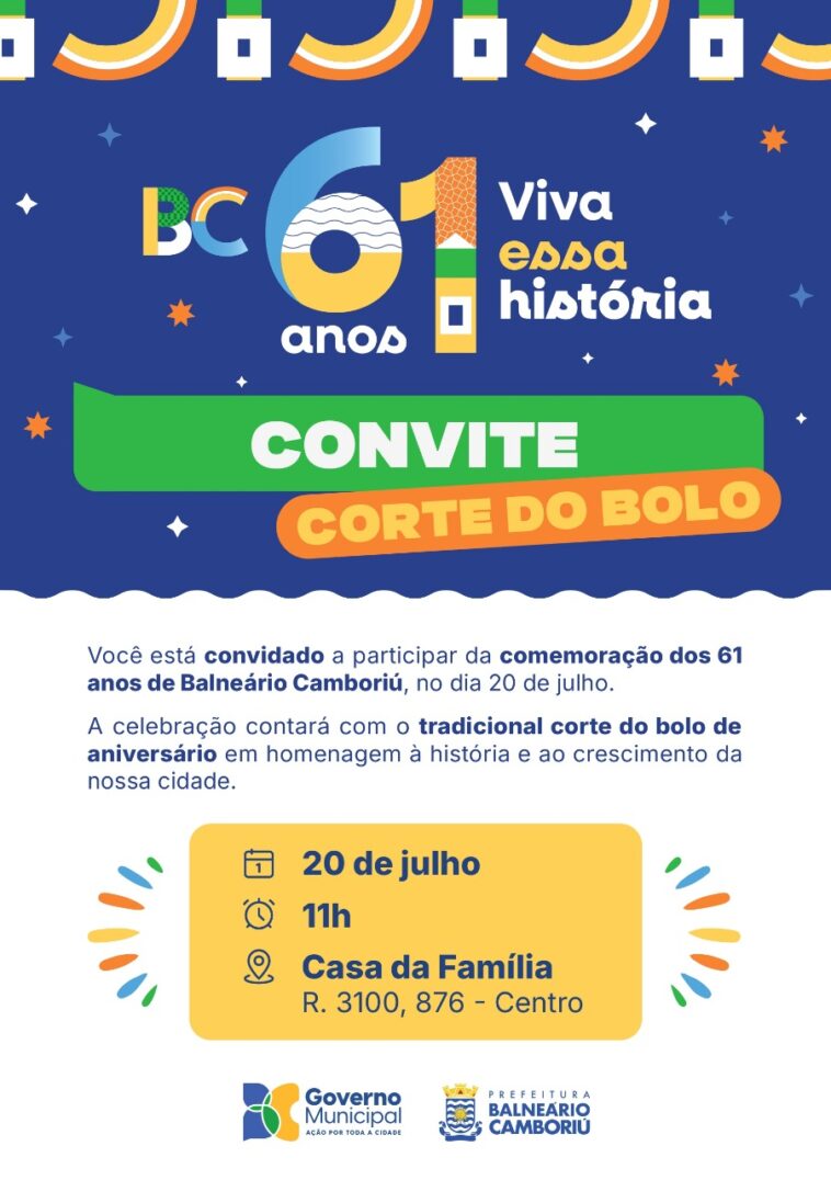 Balneário Camboriú vai comemorar seu 61º aniversário neste domingo (20) com o tradicional corte do bolo comunitário. A distribuição gratuita dos pedaços ocorrerá em dois locais: às 8h, na Praça do Pescador, no Bairro da Barra, e às 11h, na Casa da Família, na Rua 3100, nº 876, Centro.