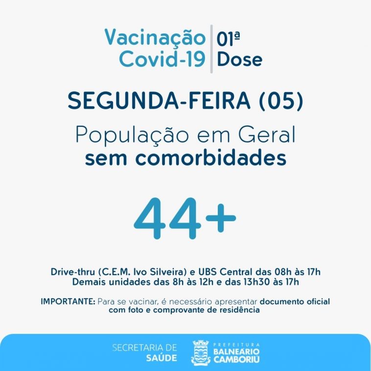 Nesta segunda-feira (05), Balneário Camboriú começa a vacinar contra Covid-19 pessoas com 44 anos ou mais. A imunização ocorre, das 8h às 17h, na Unidade Básica de Saúde Central, na Rua 1.500, e no drive-thru, ao lado do colégio Ivo Silveira. Nas demais unidades de saúde ocorre das 8h às 12h e das 13h30 às 17h. Para se vacinar é necessário apresentar documento oficial com foto e comprovante de residência.