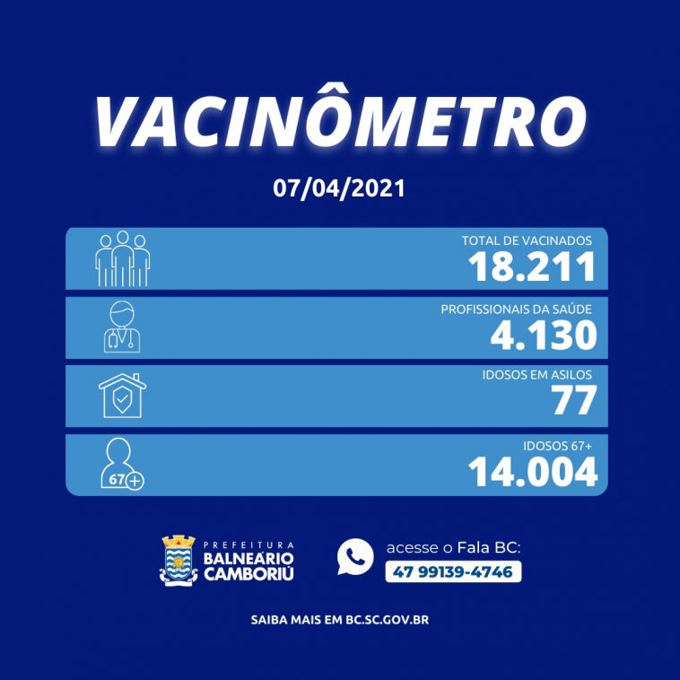 Nesta quarta-feira (07), Balneário Camboriú vacinou 174 pessoas com a primeira dose da vacina contra a Covid-19. Ao todo, 18.211 pessoas já foram vacinadas com a primeira dose, destes, 4.130 são profissionais da saúde, 14.004 são idosos com 67 anos ou mais e 77 são idosos residentes em Instituições de Longa Permanência.
