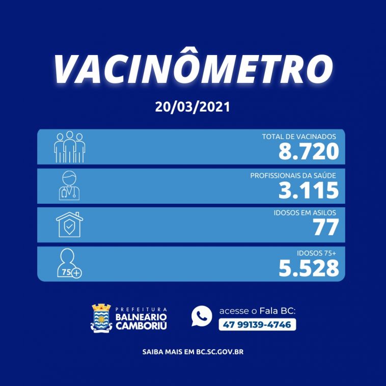 Neste sábado (20), Balneário Camboriú vacinou 330 idosos de 75 anos ou mais com a primeira dose da vacina contra a Covid-19. Ao todo, 8.720 pessoas já foram vacinadas com a primeira dose, destes, 3.115 são profissionais da saúde, 5.528 são idosos com 75 anos ou mais e 77 são idosos residentes em Instituições de Longa Permanência.