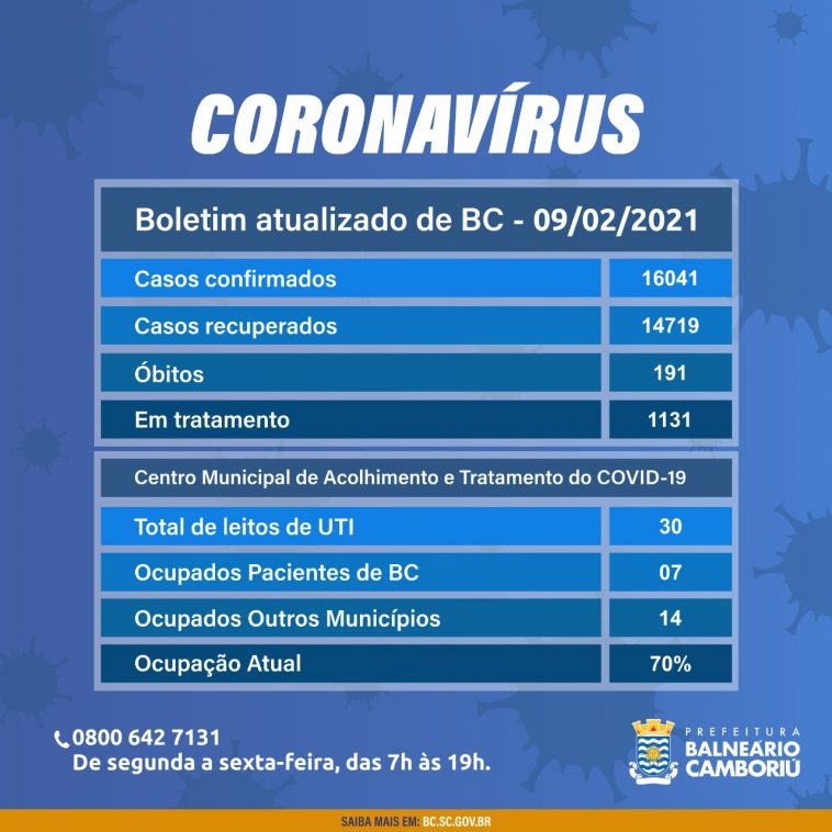 Nesta terça-feira (09), Balneário Camboriú registrou 36 novos casos confirmados de Coronavírus. O município chega a 16.041 casos confirmados, desses, 14.719 pessoas (91,7%) já estão recuperadas e receberam alta da Vigilância Epidemiológica Municipal.