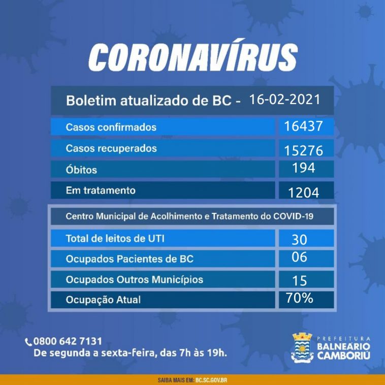 Nesta terça-feira (16), Balneário Camboriú registrou 39 novos casos confirmados de Coronavírus. O município chega a 16.437 casos, sendo que 15.276 pessoas (92,9%) já estão recuperadas e receberam alta da Vigilância Epidemiológica Municipal.