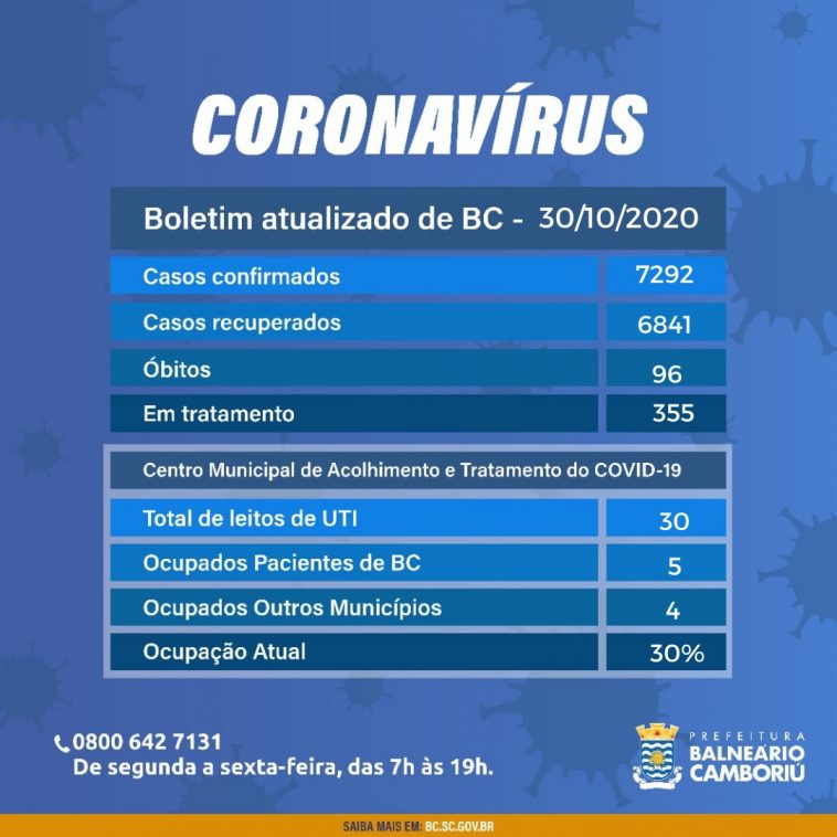 Balneário Camboriú chegou a 7.292 casos confirmados de coronavírus nesta sexta-feira (30). De ontem para hoje foram registrados 48 novos casos. Até o momento, a cidade permanece com 96 óbitos notificados.