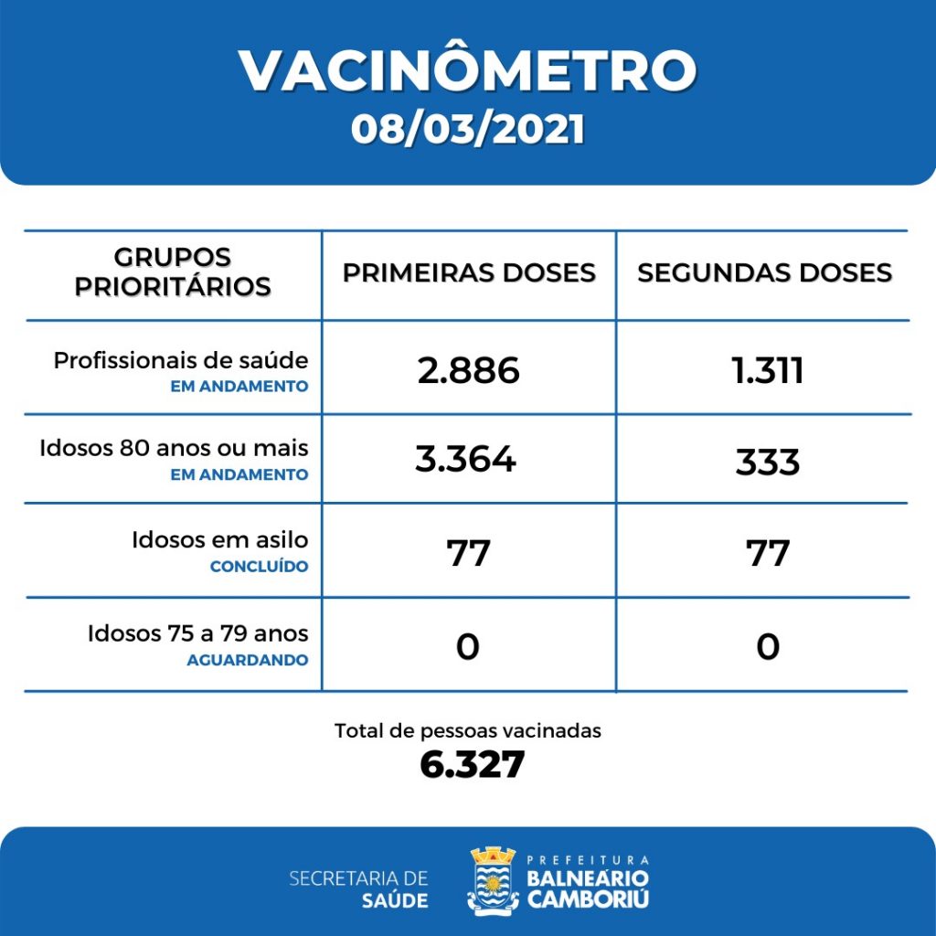 Ao todo, 6.327 pessoas já foram vacinadas com a primeira dose, destes, 2.886 são profissionais da saúde, 3.364 são idosos com 80 anos ou mais e 77 são idosos residentes em Instituições de Longa Permanência. Balneário Camboriú já aplicou 1.721 unidades da segunda dose da vacina contra o Coronavírus.