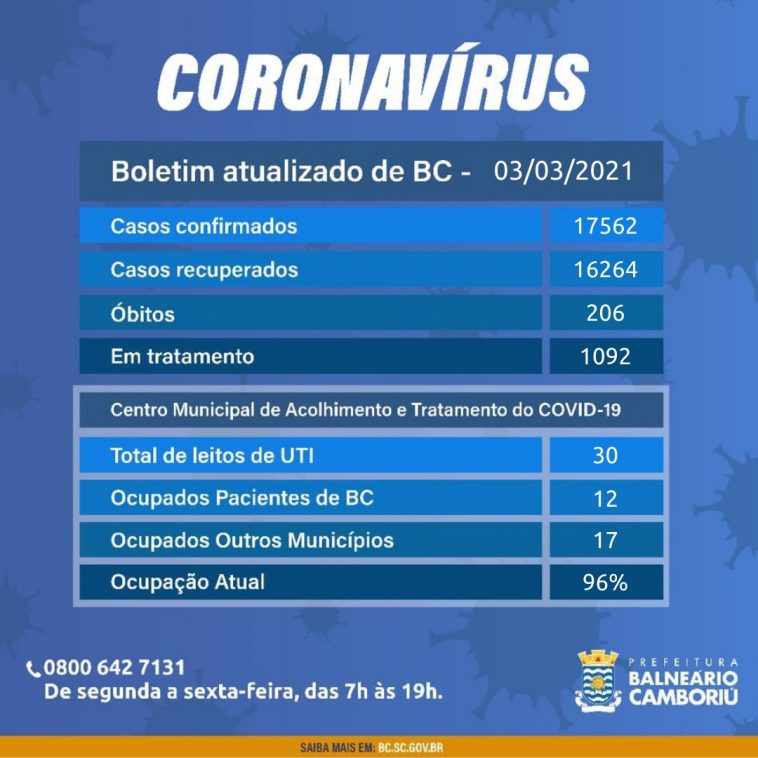 Nesta quarta-feira (03), Balneário Camboriú registrou 87 novos casos confirmados de Coronavírus. O município chega a 17.562 casos, sendo que 16.264 pessoas (92,6%) já estão recuperadas e receberam alta da Vigilância Epidemiológica Municipal.