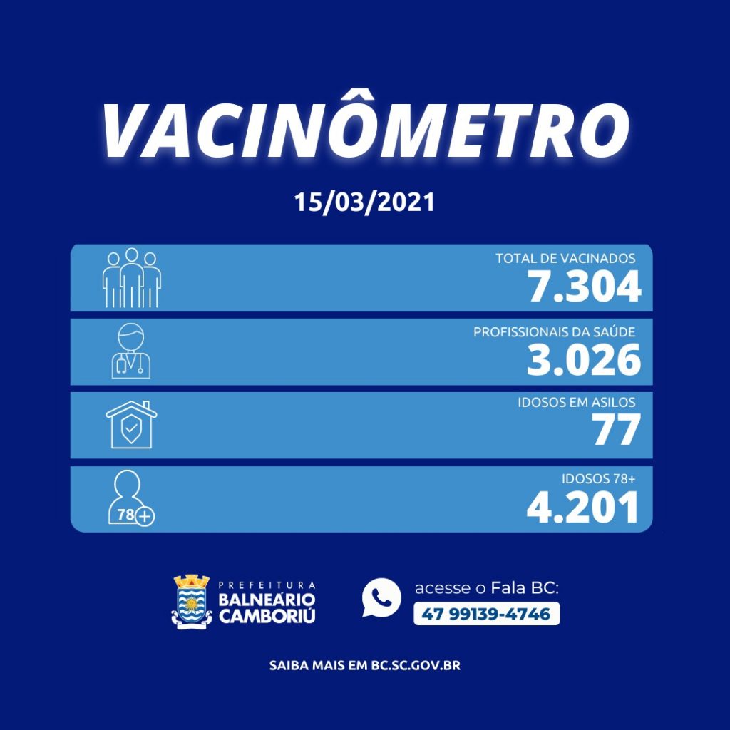Ao todo, 7.304 pessoas já foram vacinadas com a primeira dose, destes, 3.026 profissionais da saúde, 4.201 idosos com 78 anos ou mais e 77 idosos residentes em Instituições de Longa Permanência. Balneário Camboriú já aplicou 1.896 unidades da segunda dose da vacina contra o Coronavírus.