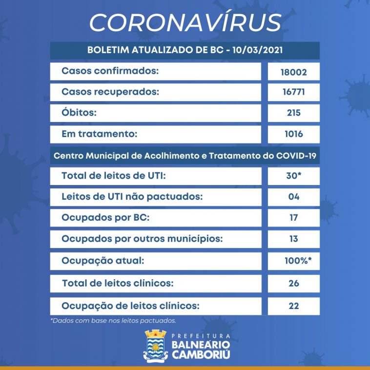 UTI COVID: 30 pacientes (17 de Balneário Camboriú, dois de Camboriú, três de Porto Belo, cinco de Itajaí, um de Navegantes, um de Itapema e um de outro estado).