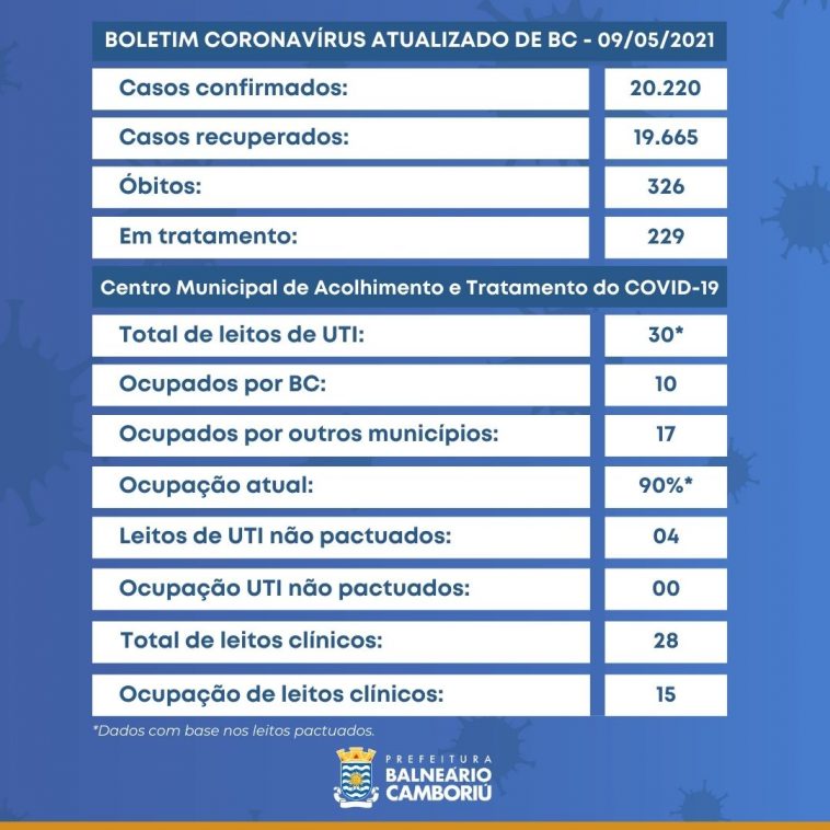 Neste domingo (09), Balneário Camboriú registrou oito novos casos confirmados de Coronavírus. O município chega a 20.220 casos, sendo que 19.665 pessoas (97,2%) já estão recuperadas e receberam alta da Vigilância Epidemiológica Municipal.