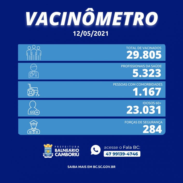 Continua a vacinação em Balneário Camboriú da primeira dose em idosos de 60 anos ou mais e segunda dose em idosos de 66 anos ou mais, além de profissionais de saúde com mais de 40 anos, nos mesmos locais e horários. Estes precisam apresentar documento oficial com foto e comprovante de residência para se vacinar. Para segunda dose é preciso apresentar carteira de vacinação. Para os profissionais de saúde é necessário também levar comprovante de vínculo empregatício.