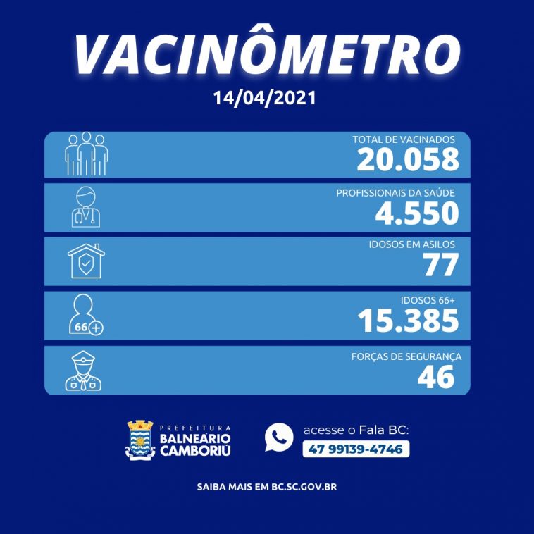 Nesta quarta-feira (14), Balneário Camboriú vacinou 172 pessoas com a primeira dose contra a Covid-19. Ao todo, o município já vacinou 20.058 pessoas com a primeira dose, destes, 4.550 são profissionais da saúde, 15.385 são idosos com 66 anos ou mais, 77 são idosos residentes em Instituições de Longa Permanência e 46 são profissionais das forças de segurança, salvamento e Forças Armadas. Balneário Camboriú já aplicou 9.848 unidades da segunda dose da vacina contra o Coronavírus.
