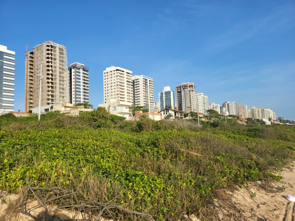 Restinga preservada e prédios construídos longe da faixa de areia, para evitar sombra na praia. (Foto: Waldemar Cezar Neto).
