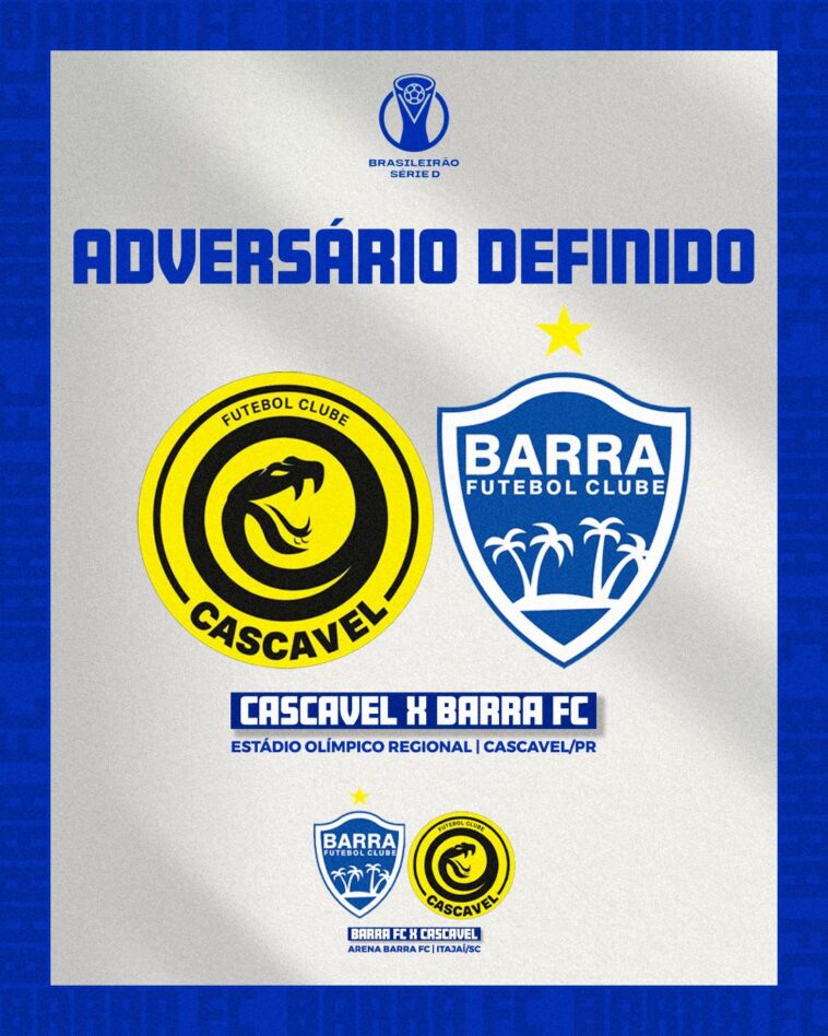 Após a confirmação da primeira colocação no Grupo A8 da Série D do Campeonato Brasileiro, o Barra FC conheceu seu adversário no primeiro mata-mata da competição nacional: o FC Cascavel-PR.