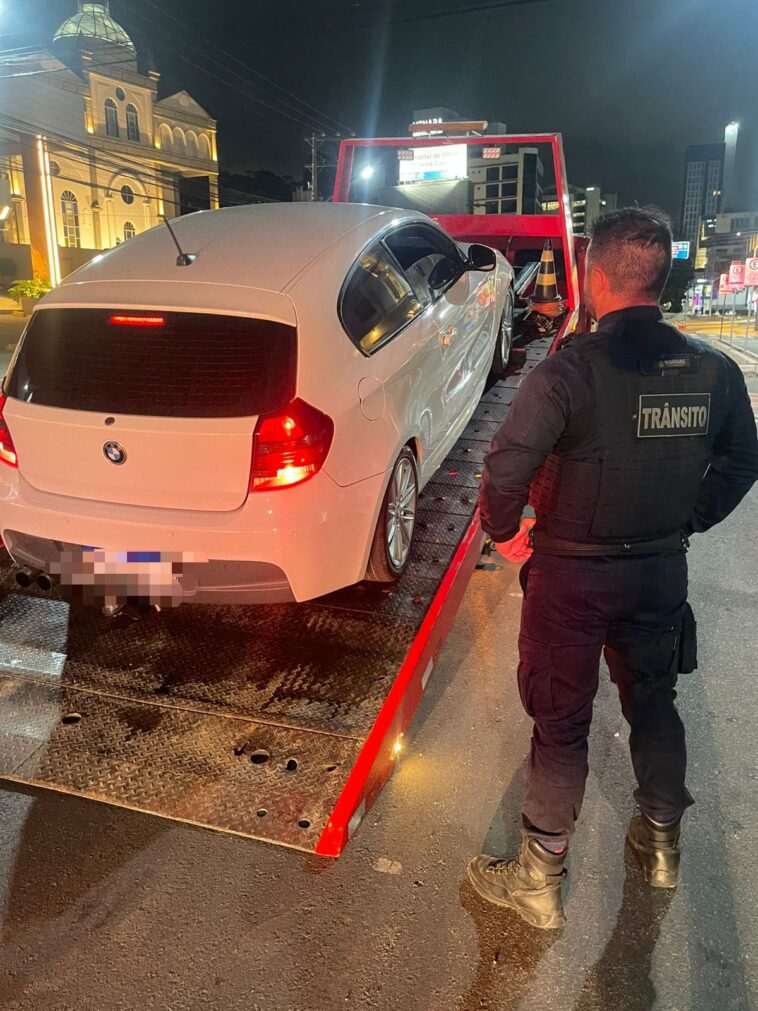 Durante a ação, os Agentes de Trânsito abordaram um veículo I/BMW/118I que emitia alto ruído proveniente do escapamento. Após consulta aos sistemas, foi constatado que o automóvel estava com licenciamento em atraso e que o condutor não possuía o curso específico de reciclagem exigido após ter a CNH suspensa, conforme a legislação vigente.