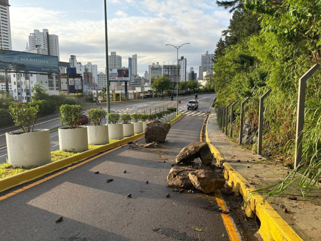 *Rolamento de blocos rochosos na Rua Indonésia; pista interditada na descida pois há risco de nova rolamentos.