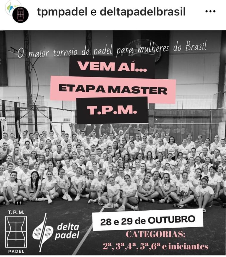 O Torneio de Padel para Mulheres (TPM) registra novo recorde de inscrições e se confirma como a maior competição feminina do esporte no Brasil. São 121 duplas na etapa master do torneio, dias 28 e 29 de outubro no Delta Padel, em Camboriú.