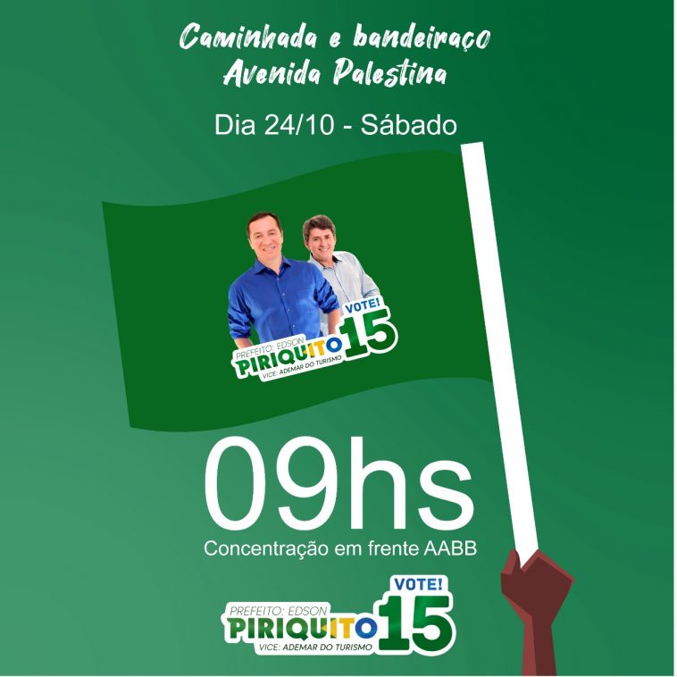 Neste sábado (24), a coligação de Edson Piriquito e Ademar do Turismo (PSB) realiza caminhada e bandeiraço na avenida Palestina, no bairro das Nações, com a participação dos candidatos a vereador.