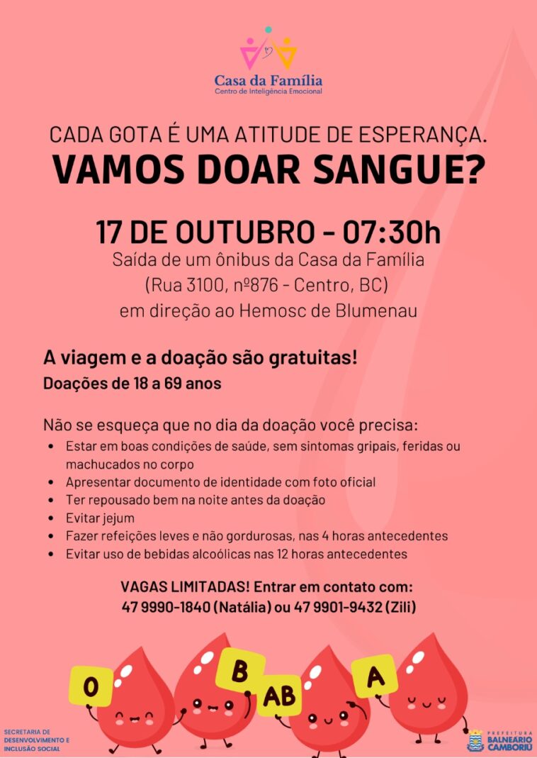 O ônibus para levar os doadores, tem previsão de saída da Casa da Família às 7h30, com previsão de retorno às 12h30. Para mais informações, pode entrar em contato pelo telefone (47) 99990-1840.
