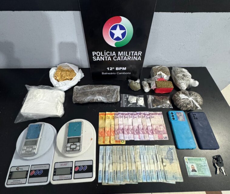 No interior do imóvel, foram encontrados 542g de crack, 741g de cocaína, 14g de haxixe e 919g de skunk, além de balança de precisão e utensílios.