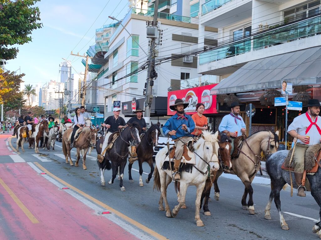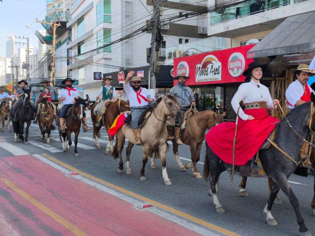 A tarde deste sábado (20) foi marcada pela aguardada Cavalgada Farroupilha, que percorreu as principais ruas e avenidas de Balneário Camboriú. Mais de 200 cavalos participaram do trajeto, formando um espetáculo que chamou a atenção de moradores e turistas. Ao longo do percurso, o público acompanhou com entusiasmo a passagem dos tradicionalistas, em uma demonstração de orgulho e valorização da cultura gaúcha.