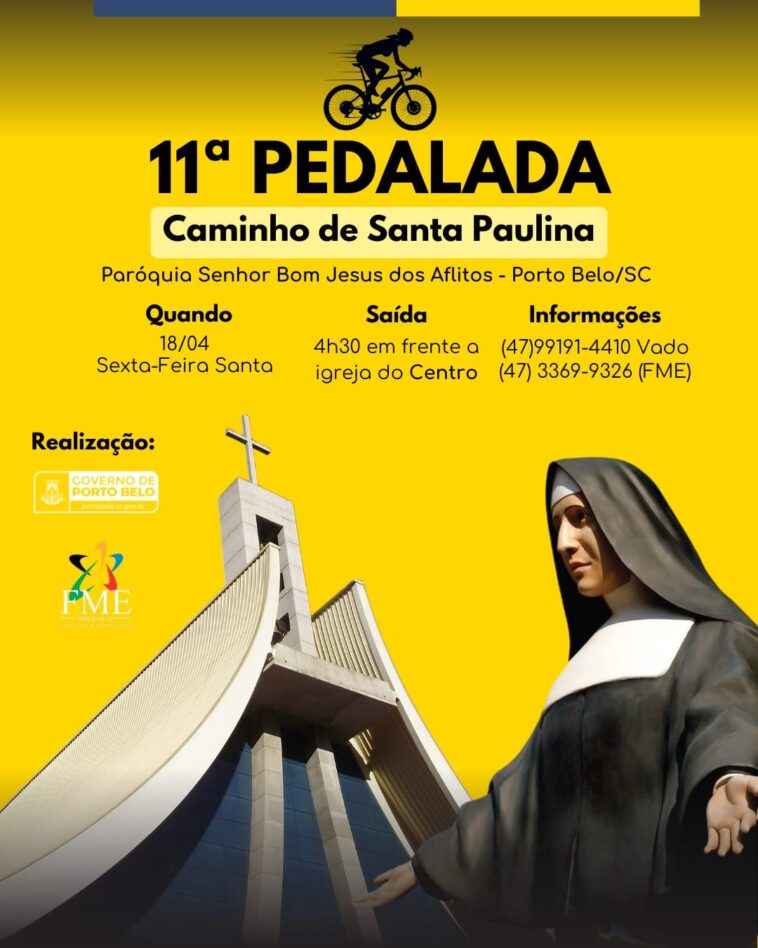 A 11ª Pedalada Caminho de Santa Paulina é realizada pelo Governo de Porto Belo, por meio da Fundação Municipal de Esportes. Os interessados em participar podem obter mais informações sobre o percurso e aquisição de camisetas pelos telefones (47) 99191-4410 ou (47) 3369-9326.