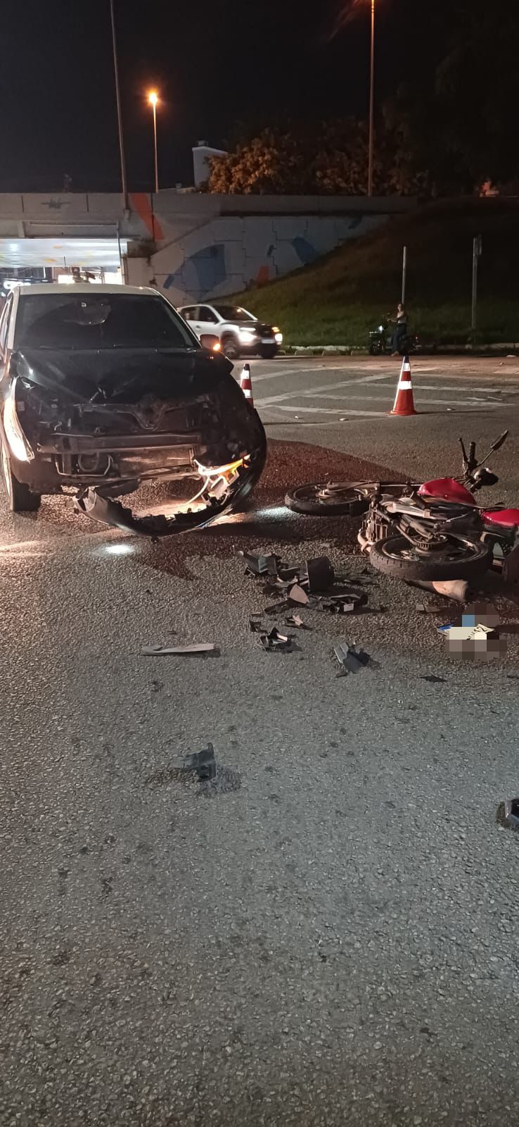 Agentes de Trânsito, que se deslocavam para outra ocorrência, se depararam com o sinistro e prestaram apoio imediato às equipes de socorro. Conforme apurado no local, o condutor de um Renault/Captur, de cor preta, teria cortado a via marginal, vindo a colidir com uma motocicleta Honda/CG 150 Start, de cor vermelha.