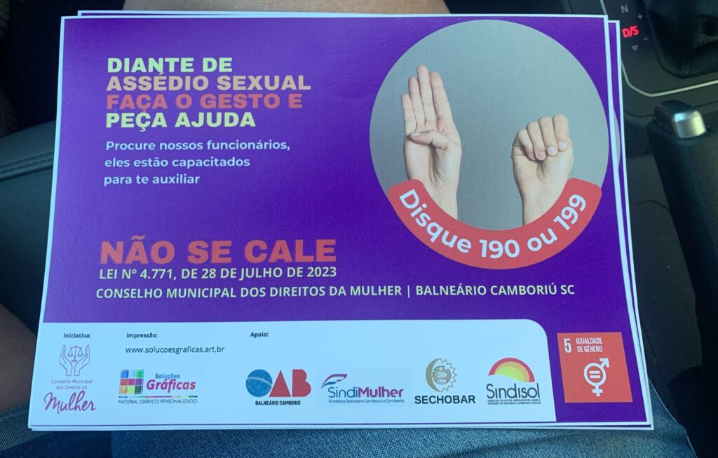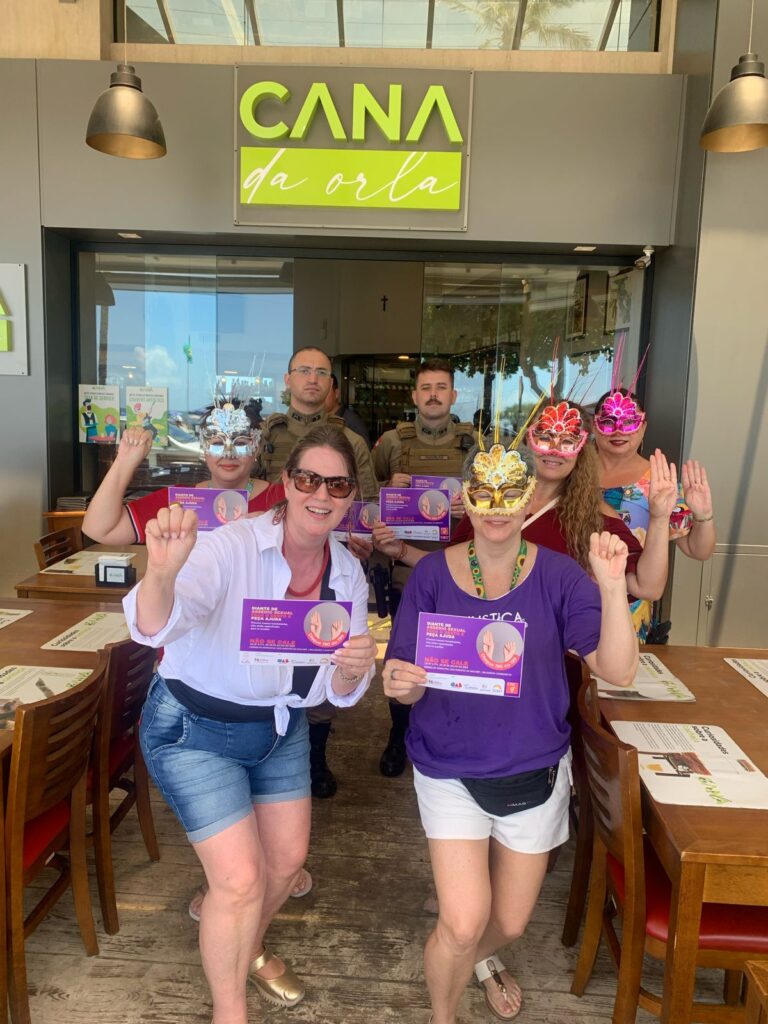 Um grupo de mulheres do COMUM Conselho Municipal do Direito da Mulher de Balneário Camboriú e outras lideranças de entidades, visitou na manhã deste domingo de carnaval restaurantes e bares da Av Atlântica. O objetivo foi conscientizar e dialogar com os profissionais que atendem o público nestes locais, para que estejam atentos e que possam acolher vítimas de violência. Além de conversar com as equipes, as conselheiras fixaram adesivos nos banheiros com a orientação e contatos de segurança que devem ser acionados nesses casos. A proposta partiu do Conselho e de acordo com a presidente, a empresária Ciça Müller, “a Lei 4771 foi homologada em 28 de Julho de 2023, proposta pelo Vereador Patrick Machado e prevê essa mobilização do setor de Bares e Restaurantes na atenção à mulheres que estejam sofrendo importunação sexual. A comunicação que elaboramos para os banheiros femininos, orienta que vítimas e pessoas que percebam o ato de violência entrem em contato com a central de atendimento policial através do 190 ou do 199. Também orienta sobre o gesto universal de pedido de socorro, de forma que seja amplamente divulgado. Ainda durante o carnaval e com o aumento do consumo de álcool, as ocorrências podem ser mais intensificadas e todos devem denunciar qualquer ato de violência.”