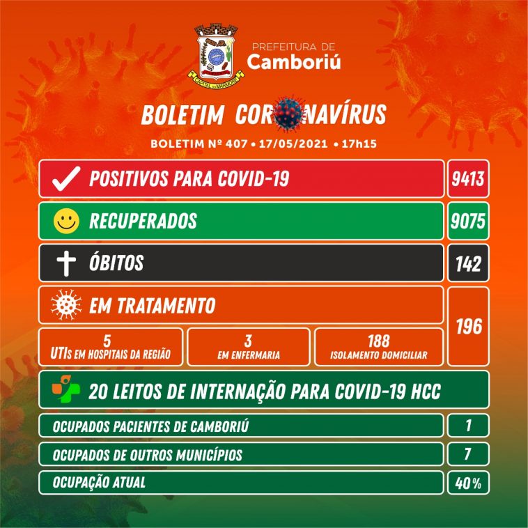 A Secretaria de Saúde de Camboriú, por meio do Departamento de Vigilância Epidemiológica, informa que nesta segunda-feira, dia 17, até às 17h, o município oficializa 46 novos casos positivos Covid-19.