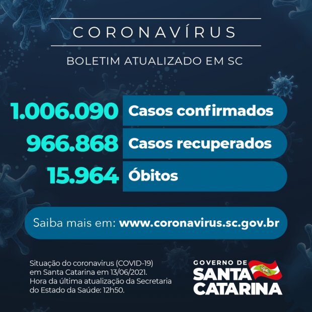 O Governo do Estado relatou que há um total de 1.006.090 casos confirmados de Covid-19 em Santa Catarina. Desses, 966.868 são considerados recuperados e 23.258 continuam em acompanhamento. O dado foi divulgado neste domingo, 13. O novo coronavírus causou 15.964 mortes no estado desde o início da pandemia. Com isso, a taxa de letalidade é de 1,59%.
