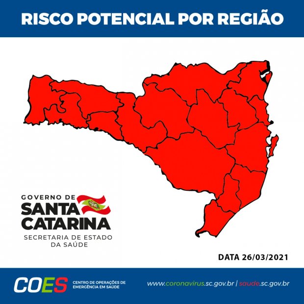Depois de cinco semanas com todas as regiões em estado gravíssimo, a Secretaria de Estado da Saúde divulgou neste sábado, 3 de abril, os dados da Matriz de Risco Potencial em relação ao novo coronavírus que apontam para uma melhora na região de Xanxerê. O mapa indica que as outras 15 regiões catarinenses se encontram em nível gravíssimo (cor vermelha) pela sexta semana consecutiva, enquanto Xanxerê é a primeira a voltar ao nível grave (cor laranja).