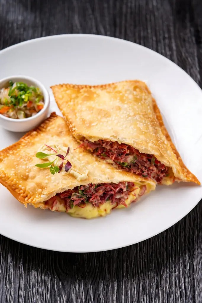 Massa artesanal recheada com batata e abóbora temperada, servida com manteiga derretida, cebola dourada e vinagrete caseiro.