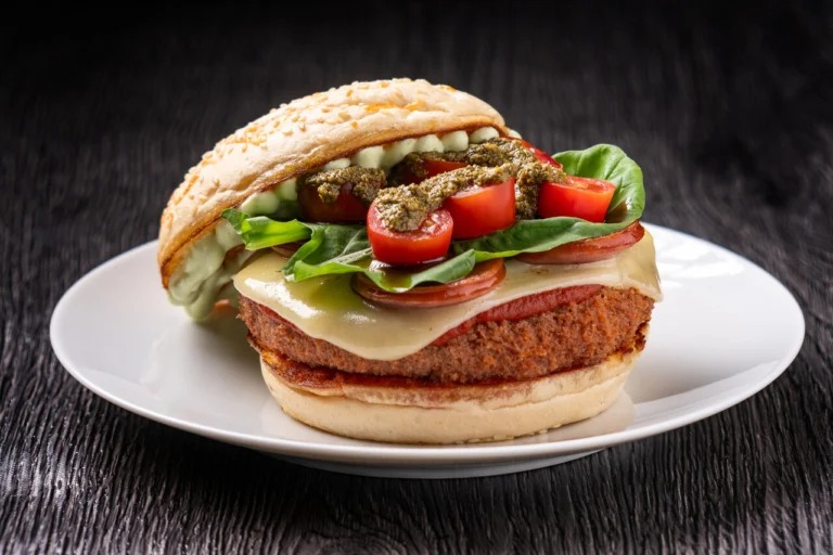 Hambúrguer empanado na panko com parmegiana caseiro, queijo muçarela, tomate-cereja, salame, rúcula e maionese ao manjericão servidos no pão italiano.