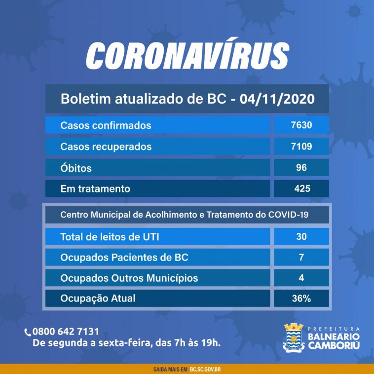 De terça para quarta-feira, Balneário Camboriú registrou 118 novos casos confirmados de coronavírus. Com isso, o município chega a 7.630 casos positivos para a doença nesta quarta-feira (04). Até o momento, foram notificados 96 óbitos.