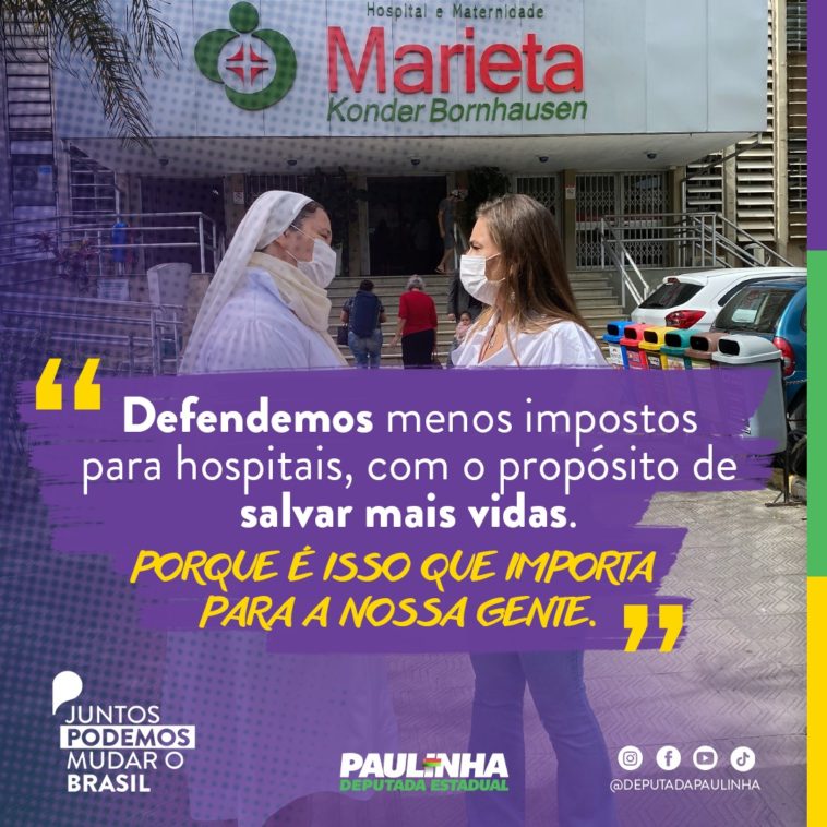 A saúde como missão em seu mandato moveu a deputada Paulinha ( Podemos) a defender menos impostos para os hospitais catarinenses. “ Menos impostos para os hospitais com o propósito de salvar mais vidas. Porque é isso que importa para a nossa gente”, avaliou ela, enaltecendo a iniciativa sensível do Governo de Santa Catarina, que construiu a Medida Provisória 250/2022, e garantiu isenção do ICMS sobre as dívidas de energia elétrica. A MP foi aprovada pelo Parlamento no final de maio e foi assunto das redes sociais da deputada Paulinha.