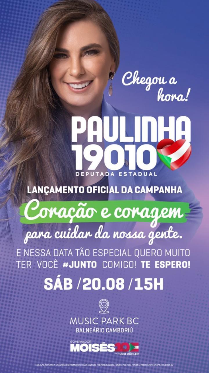 Dia 20, às 15h, em Balneário Camboriú, a deputada e candidata Paulinha ( Podemos) lança a sua campanha para a reeleição ao Parlamento catarinense. O evento está agendado para acontecer no Music Park BC na presença de lideranças e apoiadores da candidatura de Paulinha de todo o Estado. Entre as presenças confirmadas está a do Governador Carlos Moisés.