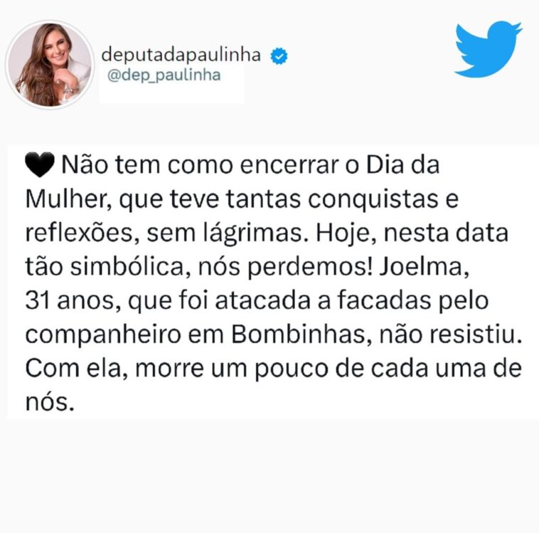 Deputada Paulinha repercute e se solidariza com mais uma morte de mulher vítima de violência doméstica em SC