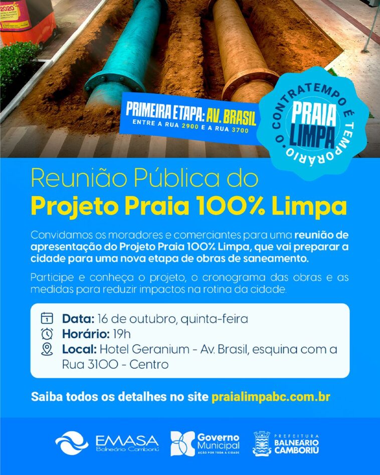 A Prefeitura de Balneário Camboriú, por meio da Empresa Municipal de Água e Saneamento (Emasa), realiza na noite da próxima quinta-feira (16) uma Reunião Pública para apresentação do Projeto Praia 100% Limpa, voltada a entidades, comerciantes e comunidade em geral. O encontro será às 19h, no Hotel Geranium, localizado na Avenida Brasil, esquina com a Rua 3100, no Centro – região por onde a obra iniciará.