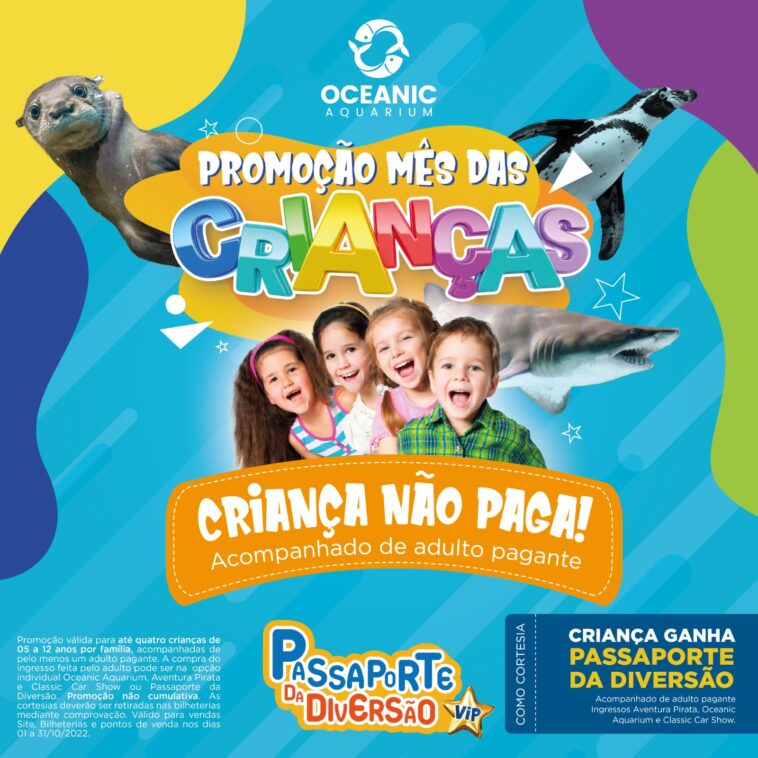 O mês das crianças começou e o Grupo Oceanic preparou uma super promoção para presenteá-las. Cada criança acompanhada de um adulto pagante entra de graça em qualquer uma das três atrações do grupo. Por exemplo, se o adulto comprar um ingresso para o Oceanic Aquarium, a criança ganha também um ingresso para visitar o aquário. Da mesma forma com o Classic Car Show ou a Aventura Pirata. Agora se o adulto adquirir o Passaporte da Diversão, a criança também ganha um passaporte, ou seja, um ingresso para cada uma das atrações!