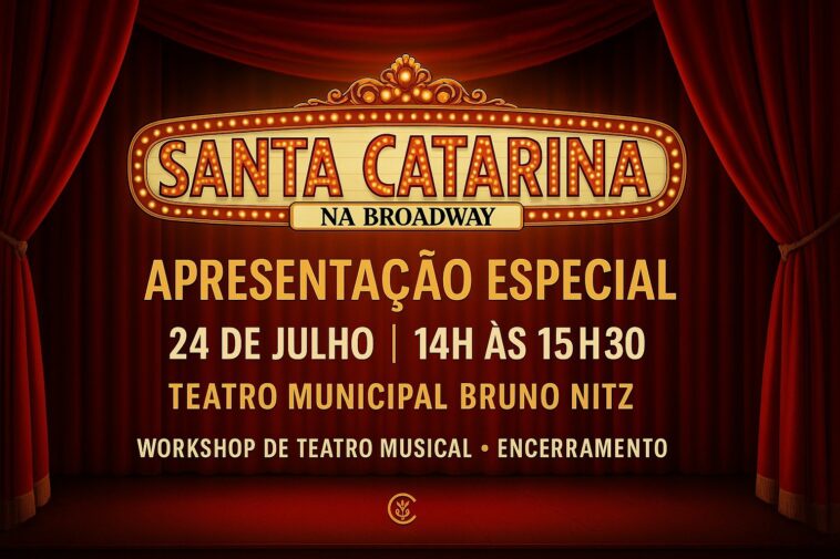 Nesta quinta-feira (24), às 14h, o Teatro Municipal Bruno Nitz recebe o espetáculo “Santa Catarina na Broadway”. A entrada é gratuita.
