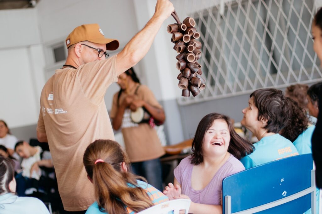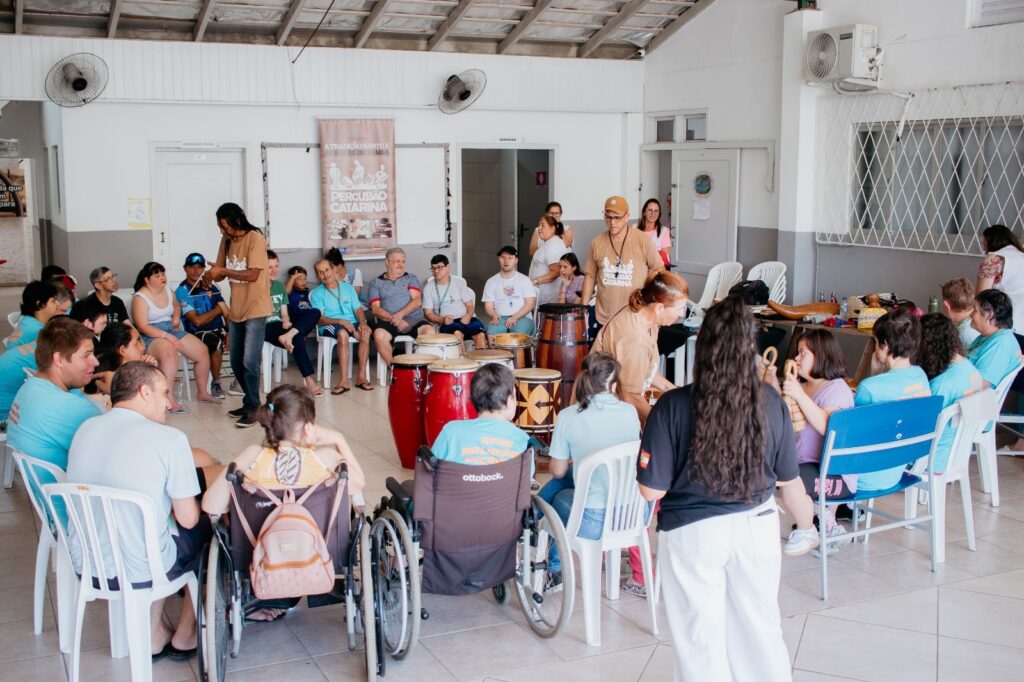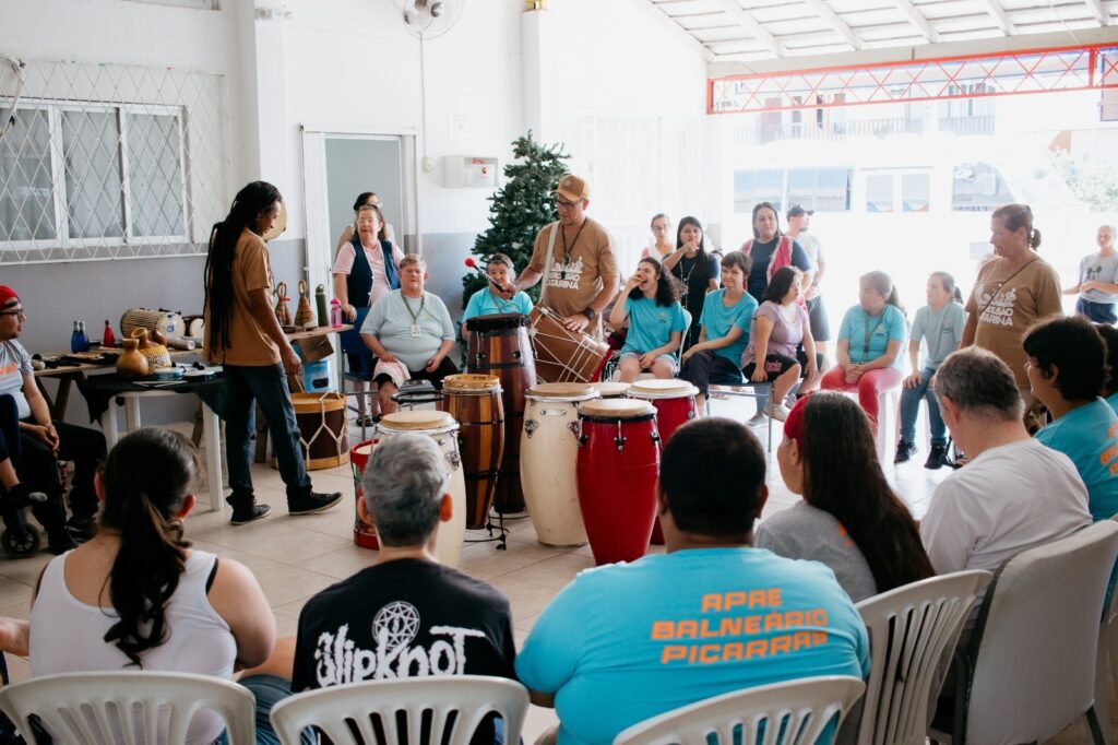 Na última sexta-feira (5), estudantes da APAE de Balneário Piçarras participaram de uma oficina especial de percussão conduzida pelo músico e educador musical Luciano Candemil, dentro da circulação estadual do projeto Percussão Catarina. A atividade foi pensada especialmente para o público da instituição, valorizando a acessibilidade, a vivência musical sensorial e a interação coletiva por meio dos ritmos afro-brasileiros.